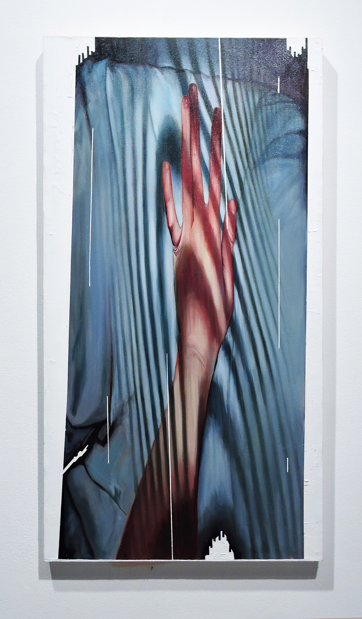 This body of work is a meditation on interface; specifically, it is concerned with the interface between our physical, corporeal world and the heterotopic spaces arising from the world – what Foucault described as “placeless places” in his essay,Of Other Spaces: Utopias and Heterotopias (1984). These places are so assimilated that our bodies have become symbiotic with them, becoming invisibly dependent on visibility. I ask how the body becomes integrated into this voyeuristic digital melting pot, oriented as landscapes that are not concise in their place, time, or consent. Though the viewer is inclined to believe there is something real about what is seen (at least at some point), the method to which this information is delivered is very un-real. Translucent color, warped planes, optical portages, and fringe interference patterns intersect the body; consequentially, there is a tension between what feels like a moment of intimacy between the viewer and the subject, and the reality of the subject’s digital infidelity. This transaction moves as quickly forward as it does away, revealing nothing but an interface: a surface which mediates multiple points of contact. Ultimately, this body of work traps this transaction, bringing body, space, time into suspension.